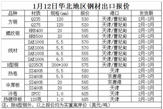 1月12日華北地區鋼材出口報價參考